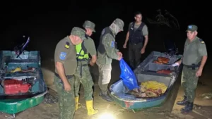 En ese sector, los sospechosos arrojaron varios bultos al agua y escaparon a pie desde la barranca, incluso lanzando objetos contra el personal policial para facilitar la huida. En el lugar, los efectivos lograron secuestrar dos embarcaciones equipadas con motores fuera de borda Mercury de 25 HP, además de productos cárnicos entre los que se encontraban un cuarto, un costillar y una paleta, presuntamente producto de faena ilegal.