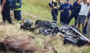 Según la información preliminar obtenida, el siniestro se registro cerca de las 11:30horas, donde un hombre de 52 años de edad, a bordo de una motocicleta – marca Beta Zontes de 350cc.- y un animal equino, por causas y circunstancias que se investigan habrían colisionado, siendo rápidamente auxiliados, siendo el hombre trasladado al Hospital Escuela de la Ciudad de Corrientes, donde tras ser examinado se determino que posee lesiones de carácter graves.