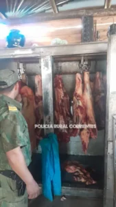 Personal de la Policía Rural y Ecológica de Lavalle dentro del contexto del «Plan integral de seguridad integral y prevención del abigeato y control masivo de carnicerías», diagramado por la Jefatura de Policía e implementado en toda la provincia, en la jornada de ayer realizaron inspecciones en Santa Lucía y detectó carne faenada sin controles en una carnicería, ubicada en calle Lavalle al 1100.