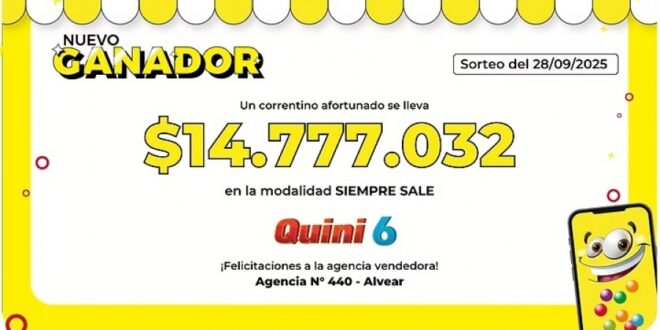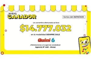 En el sorteo de anoche del Quini 6, modalidad Siempre Sale, un vecino de la localidad de Alvear se convirtió en el nuevo millonario de Corrientes. El afortunado acertó cinco números y se llevó un premio de $14.777.032.